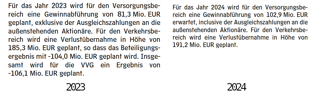 Im Beteiligungsbericht 2024 erwartet die VVG eine Gewinnabführung in Höhe von 102,9 Mio. EUR, jedoch inklusive Ausgleichszahlungen an die außenstehenden Aktionäre. Pro Jahr werden ca. 20 Mio. EUR als Ausgleichszahlung (durch die VVG) abgeführt, was ca. der Differenz zwischen den Werten der Beteiligungsberichte 2023 und 2024 entspricht. Die Werte sind in beiden Berichten auf Seite 76 zu finden.
