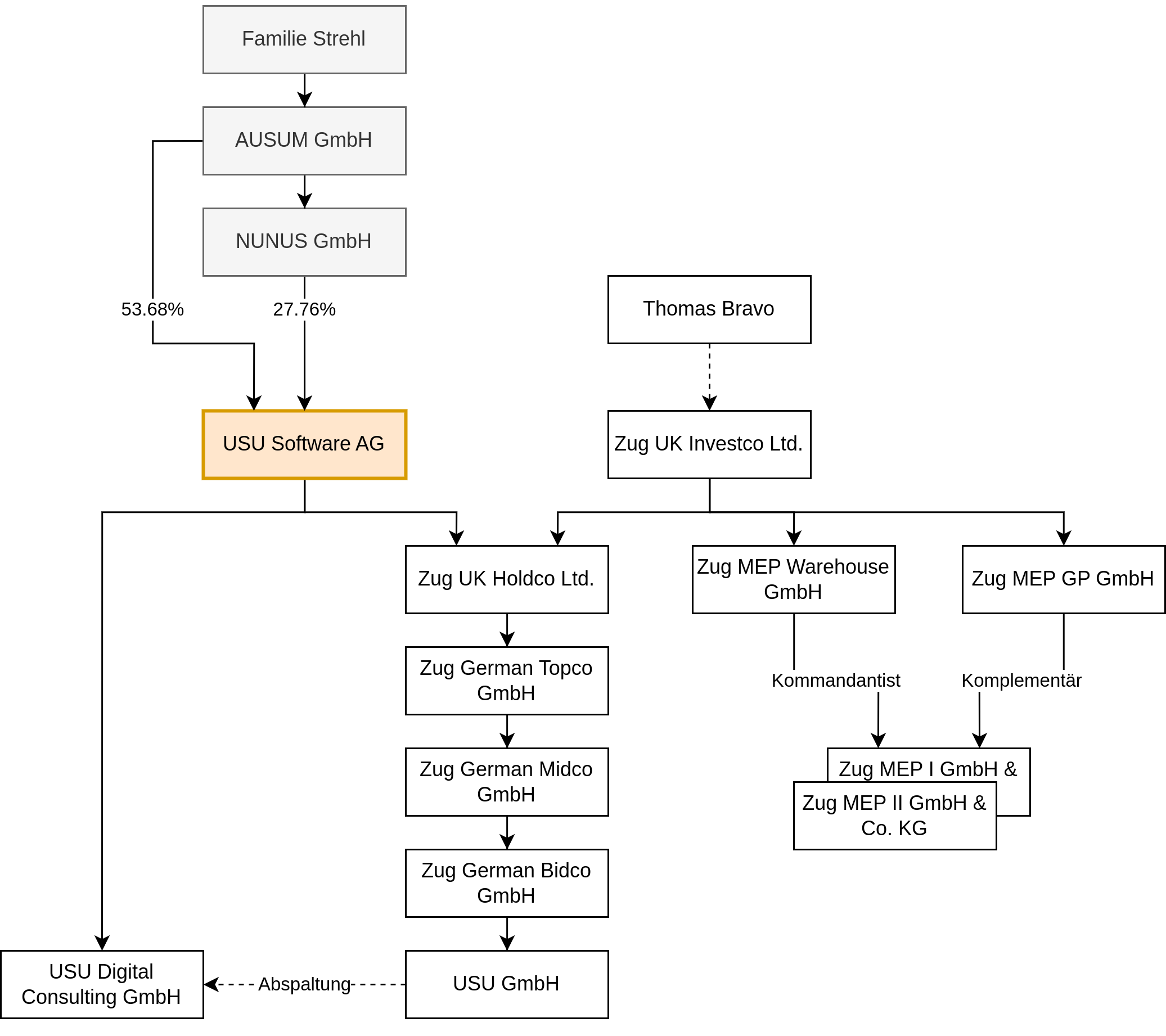 Die folgende Grafik zeigt die Unternehmenskette, welche Thomas Bravo für die Übernahme der USU GmbH, welche das Produktgeschäft beinhaltet, verwendet.