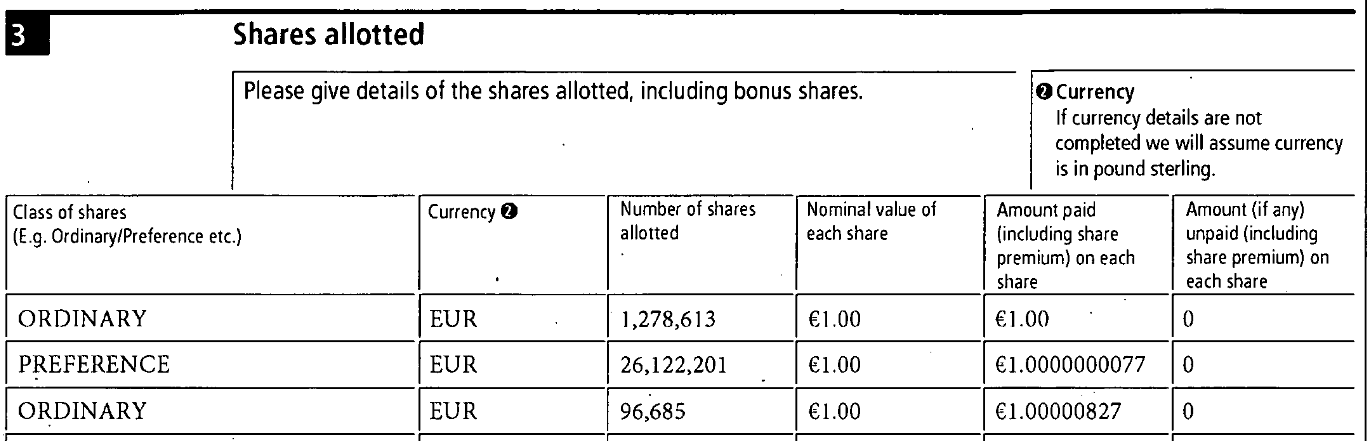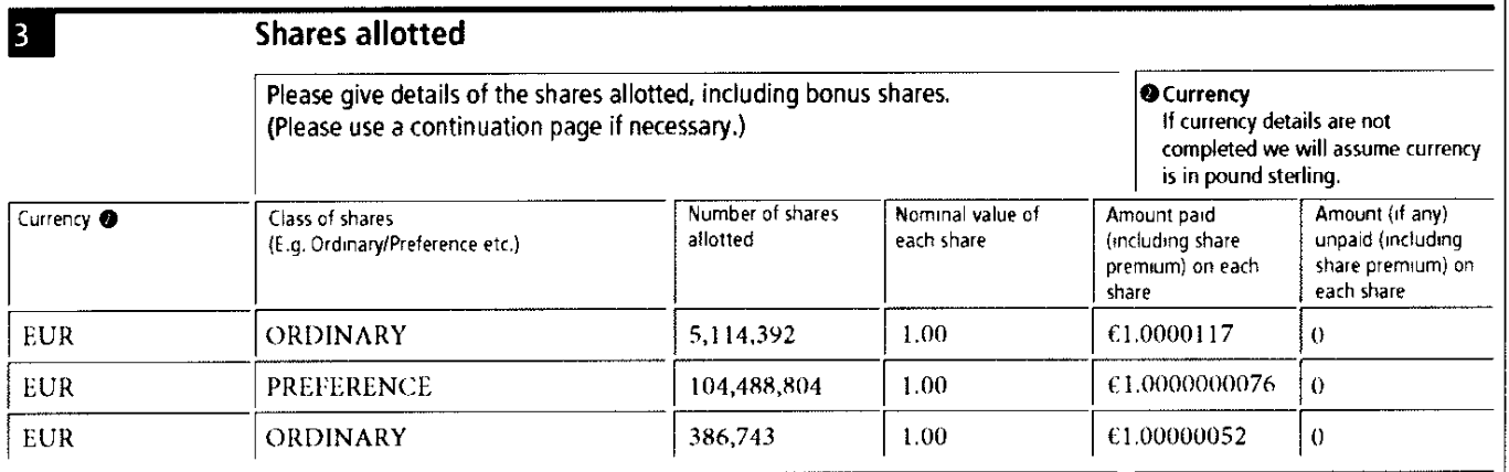 Der letzten Veröffentlichung zufolge hat die Zug UK Holdco ein Gesamtkapital von 137,487,498 Aktien, aufgeteilt in 6,876,493 ordinary und 130,611,005 preference shares. Aus der obigen Tabelle würden sich 6,876,433 ordinary shares ergeben, die Differenz erscheint mir jedoch unbedeutend.